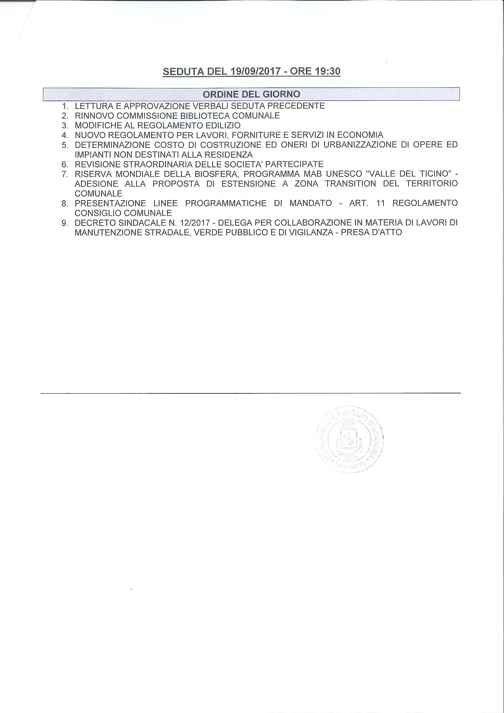 Si rende noto che è fissata per il giorno di Martedì 19 Settembre 2017 alle ore 19.30 l'adunanza del Consiglio Comunale presso la Sede Municipale, ed in seconda convocazione per il giorno di Mercoledì 20 Settembre 2017 alle ore 8.00, per deliberare sull'ordine del giorno qui allegato.