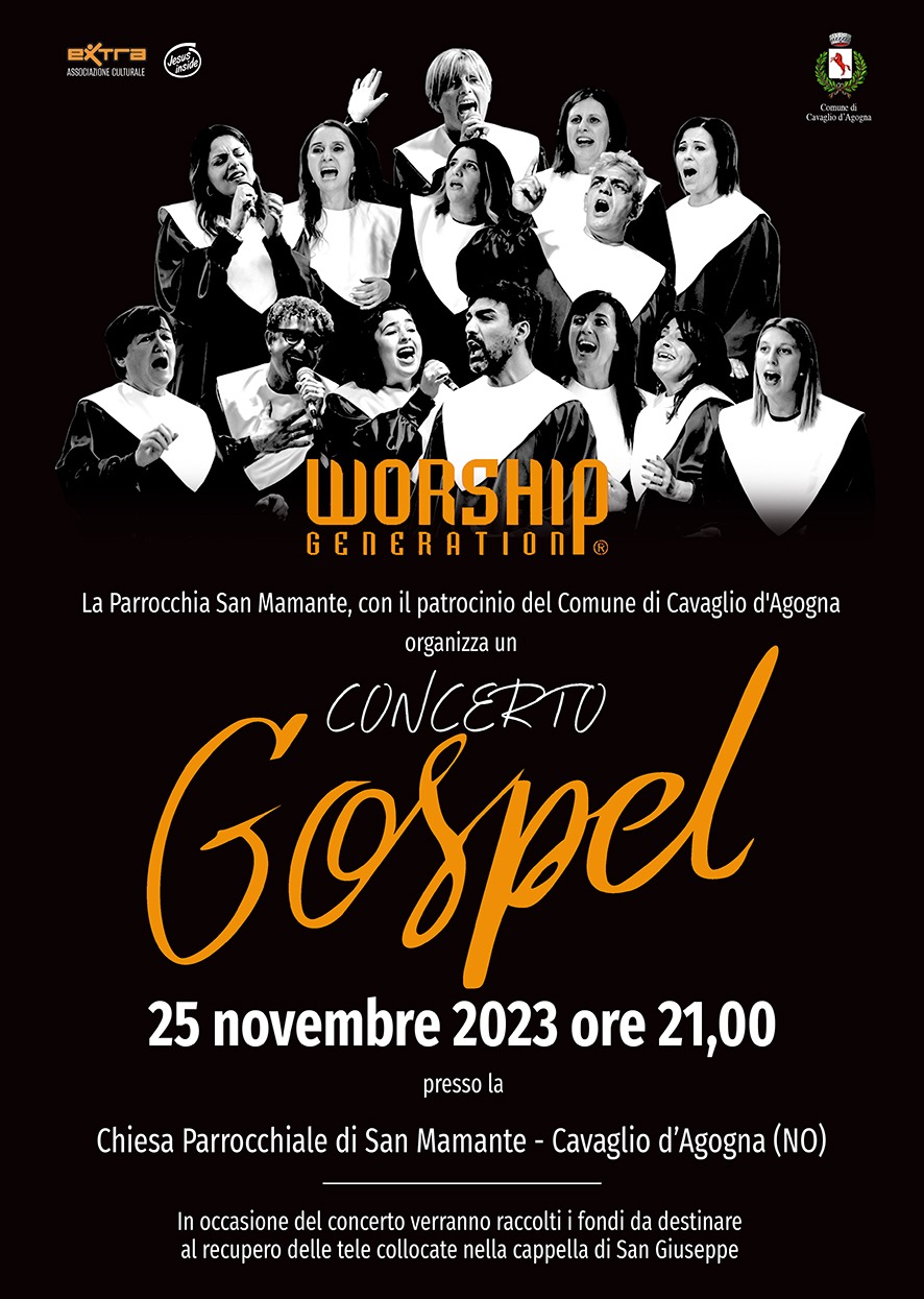 La Parrocchia di San Mamante, con il patrocinio del Comune di Cavaglio d'Agogna organizza un "Concerto Gospel" Sabato 25 Novembre 2023 alle ore 21,00 presso la Chiesa parrocchiale di San Mamante in Cavaglio d'Agogna.