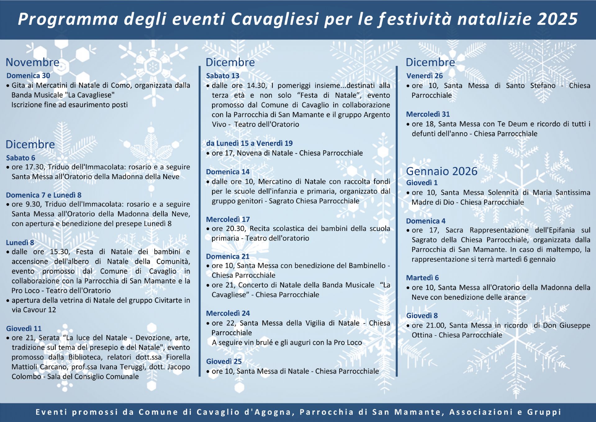 Calendario degli eventi Cavagliesi per le festività natalizie 2025 Si rimanda all'immagine allegata per ogni dettaglio.