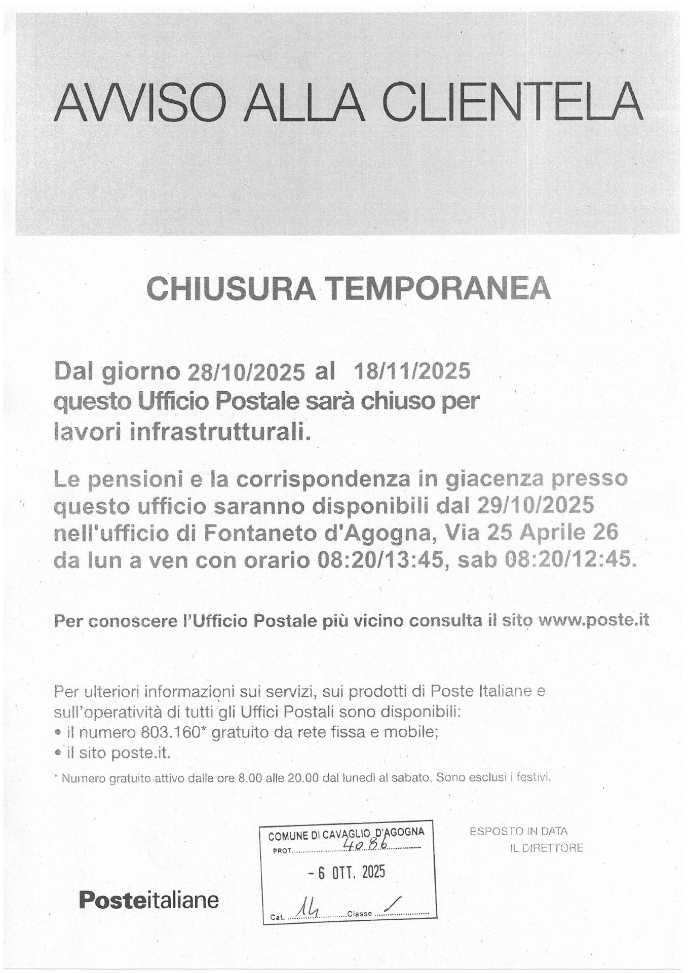 Chiusura temporanea dal giorno 28/10/2025 al 18/11/2025 l'Ufficio Postale di Cavaglio d'Agogna sarà chiuso per lavori infrastrutturali.