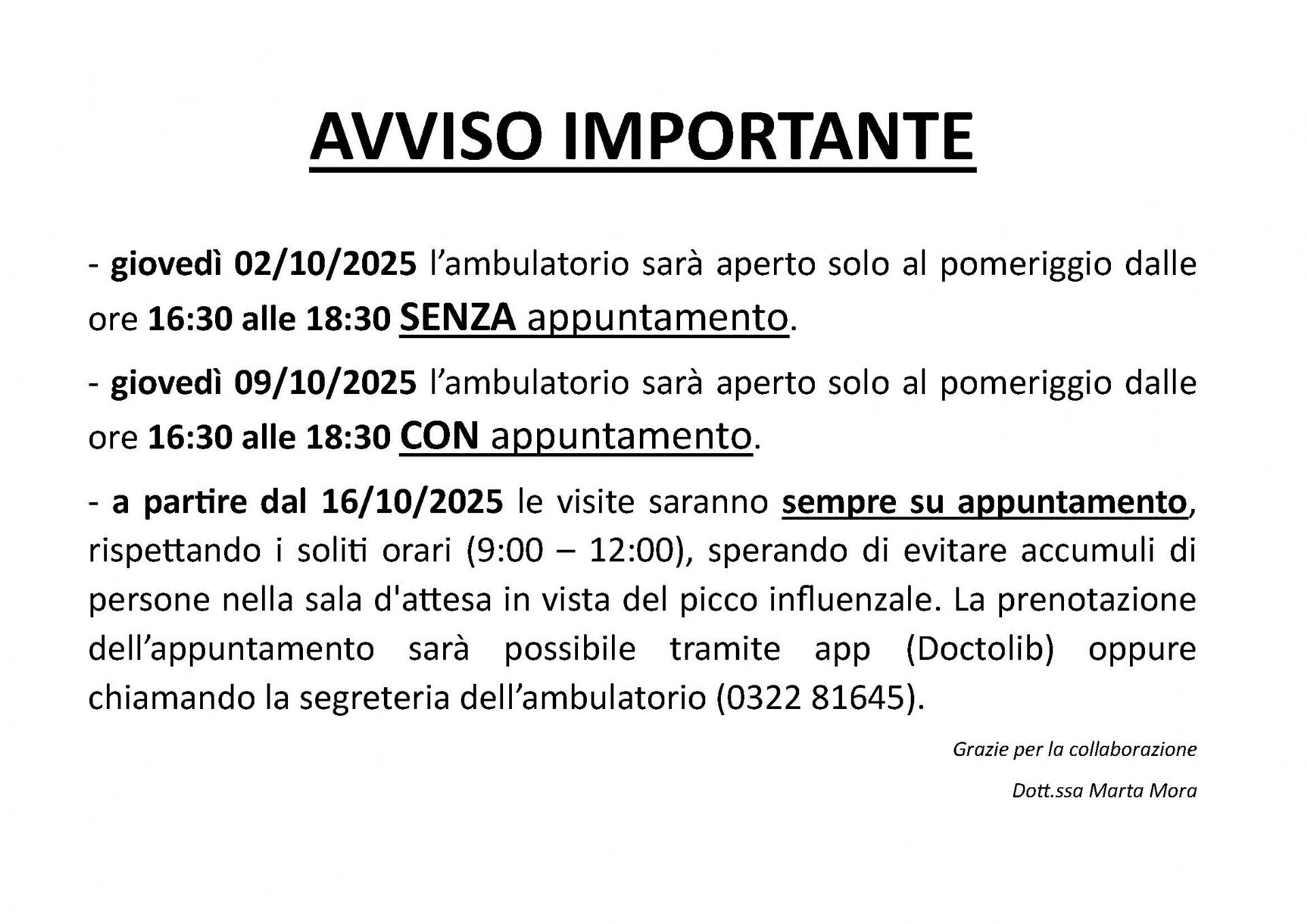 Modifica temporanea orario ambulatorio Cavaglio d'Agogna dott.ssa Marta Mora