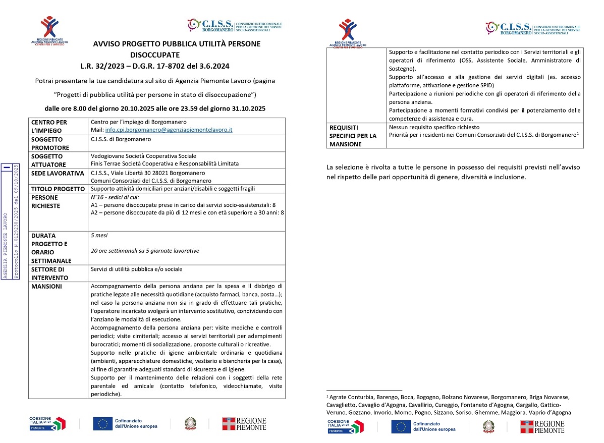 Avviso Progetto Pubblica Utilità persone disoccupate L.R. 32/2023 – D.G.R. 17-8702 del 3.6.2024