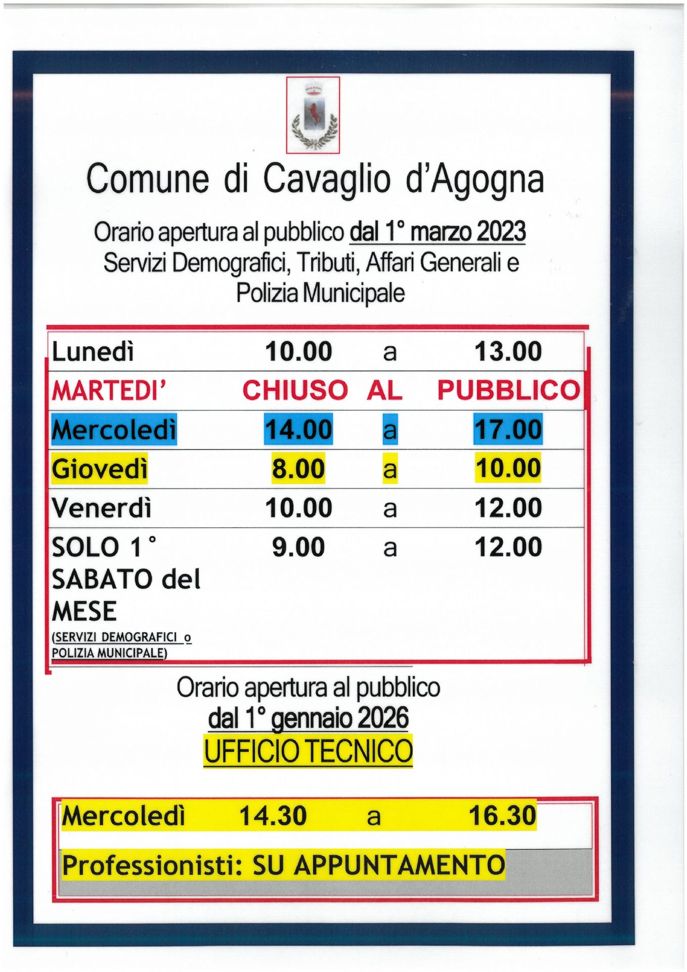 Si avvisa la popolazione dell'apertura al pubblico dell'ufficio Tecnico dal 1° gennaio 2026 nei seguenti giorni e orari: