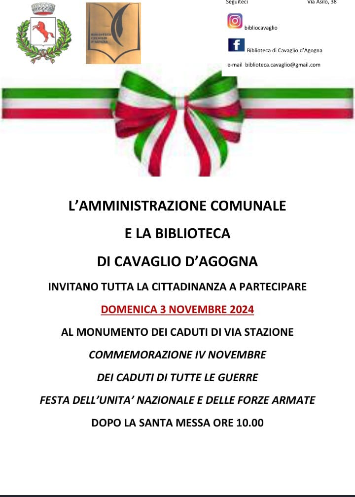 L'Amministrazione Comunale e la Biblioteca di Cavaglio d'Agogna invitano tutta la cittadinanza a partecipare Domenica 03 Novembre 2024 al monumento dei Caduti di Via Stazione alla commemorazione del IV Novembre dei caduti di tutte le guerre, festa dell'unità nazionale e delle Forze armate dopo la Santa messa ore 10.00