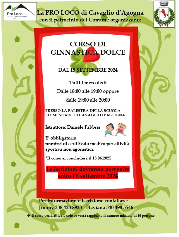 La Pro Loco di Cavaglio d'Agogna (No) con il patrocinio del Comune organizzano un Corso di ginnastica dolce dal 18 settembre 2024 tutti i mercoledì dalle ore 18.00 alle ore 19.00 oppure dalle 19.00 alle 20.00 presso la palestra della scuola elementare di Cavaglio d'Agogna (No).