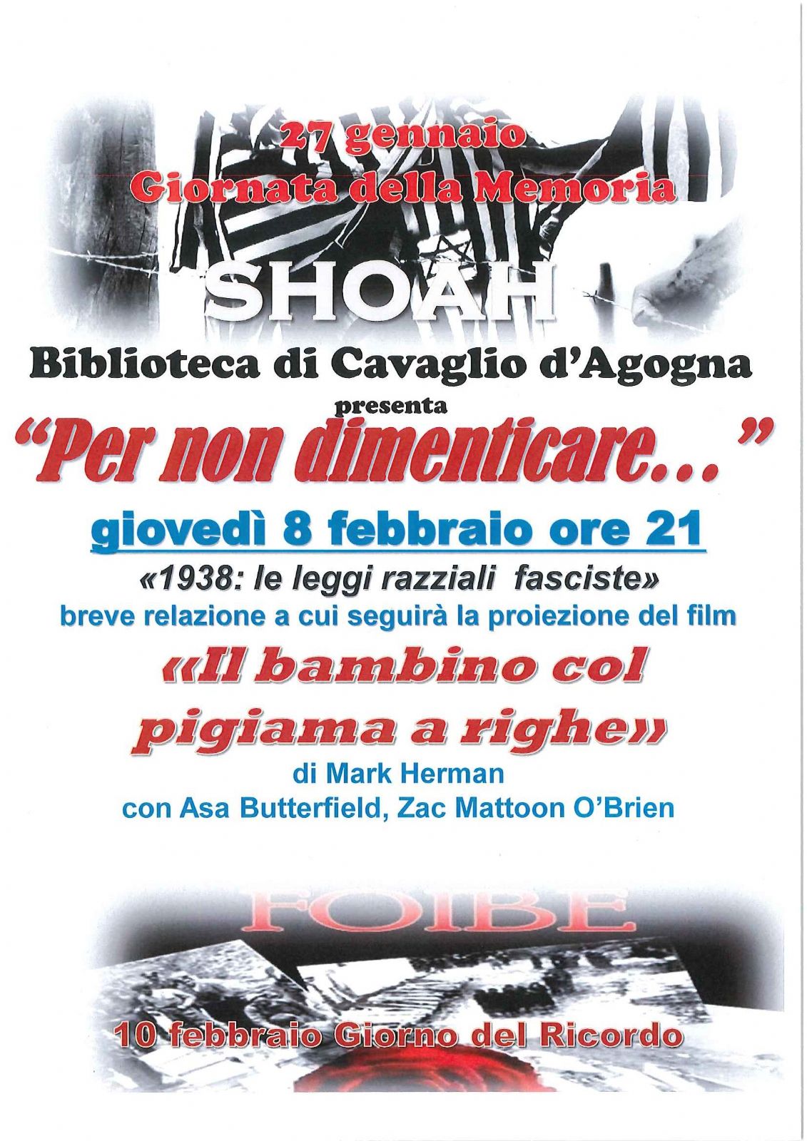 LA BIBLIOTECA DI CAVAGLIO D'AGOGNA PRESENTA "PER NON DIMENTICARE..." GIOVEDI' 08 FEBBRAIO 2018 ORE 21.00 "1938: LE LEGGI RAZZIALI FASCISTE" BREVE RELAZIONE A CUI SEGUIRA' LA PROIEZIONE DEL FILM "IL BAMBINO COL PIGIAMA A RIGHE" DI MARK HERMAN CON ASA BUTTERFIELD, ZAC MATTOON O'BREIN.