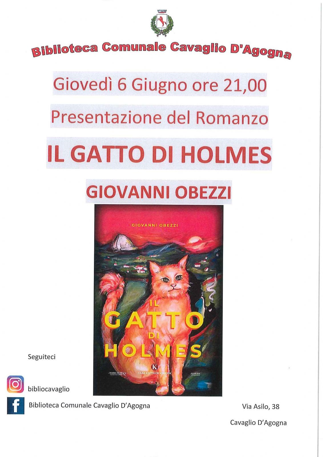 Giovedì 6 Giugno alle ore 21,00 presso la Biblioteca Comunale di Cavaglio d'Agogna verrà presentato il romanzo "Il gatto di Holmes" di Giovanni Obezzi.