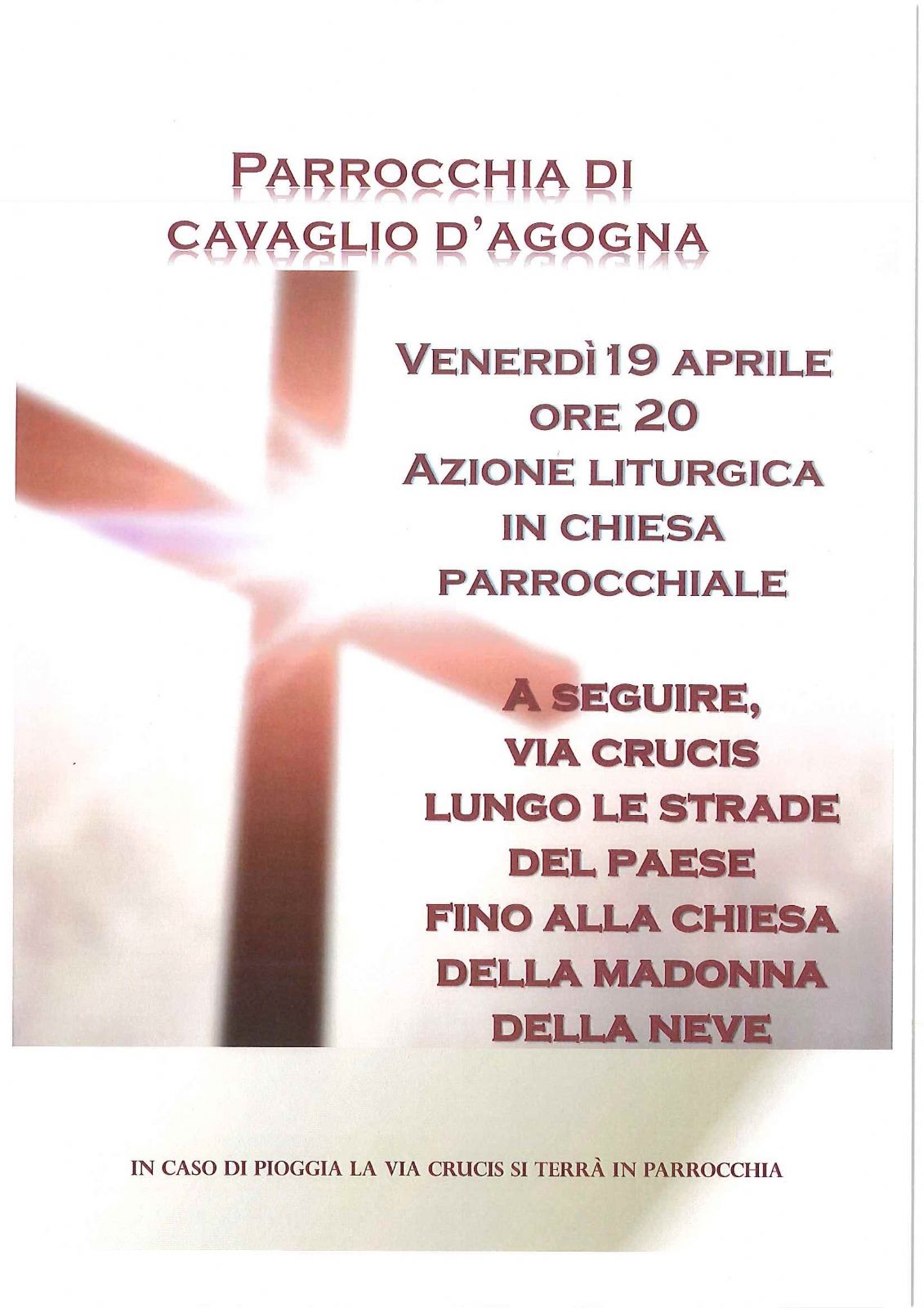 VENERDI' 19 APRILE ORE 20.00 AZIONE LITURGICA IN CHIESA PARROCCHIALE, A SEGUIRE VIA CRUCIS LUNGO LE STRADE DEL PAESE FINO ALLA MADONNA DELLA NEVE.