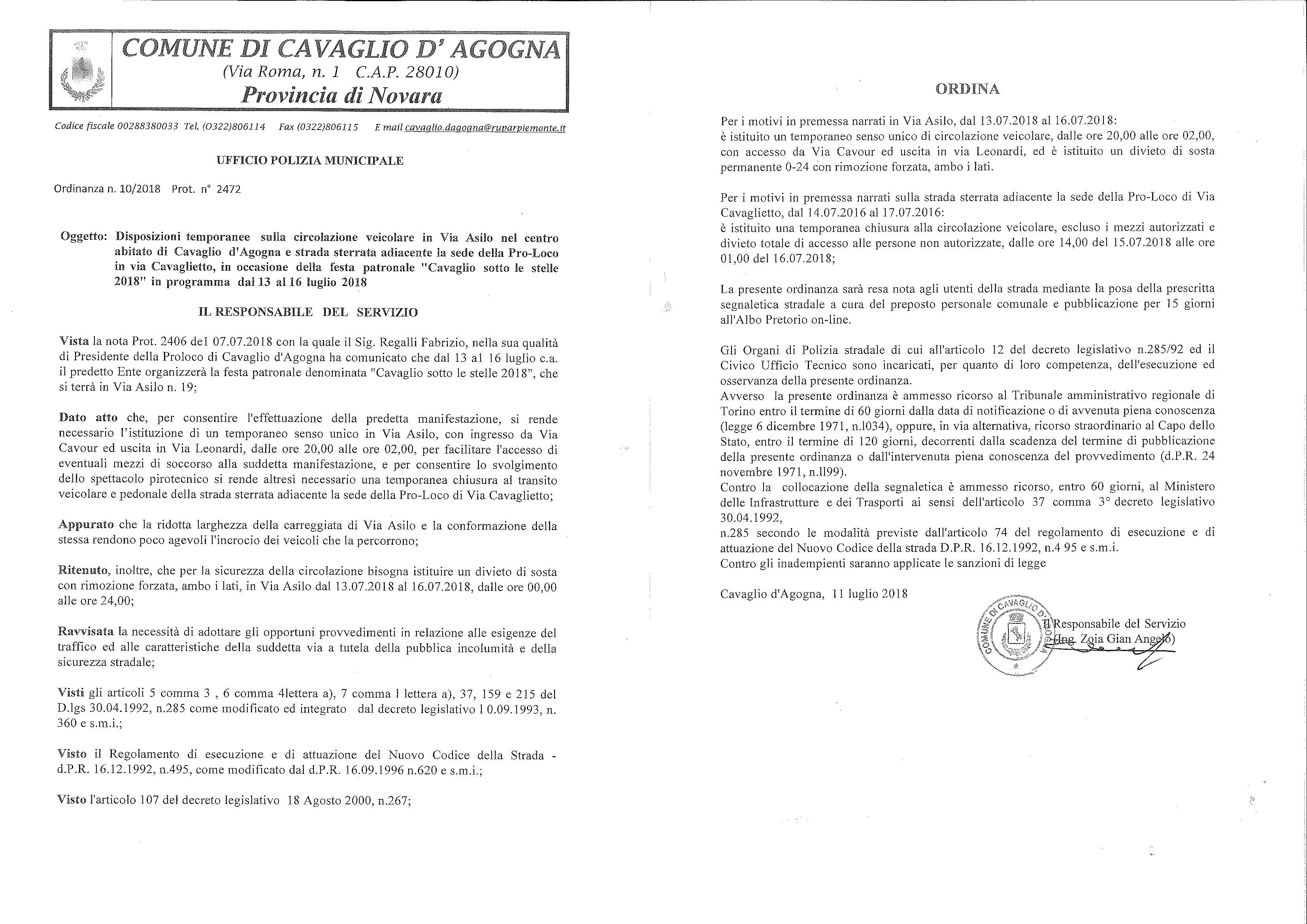 DISPOSIZIONI TEMPORANEE SULLA CIRCOLAZIONE VEICOLARE IN OCCASIONE DELLA FESTA PATRONALE "CAVAGLIO SOTTO LE STELLE 2018" IN PROGRAMMA DAL 13 AL 16 LUGLIO 2018
