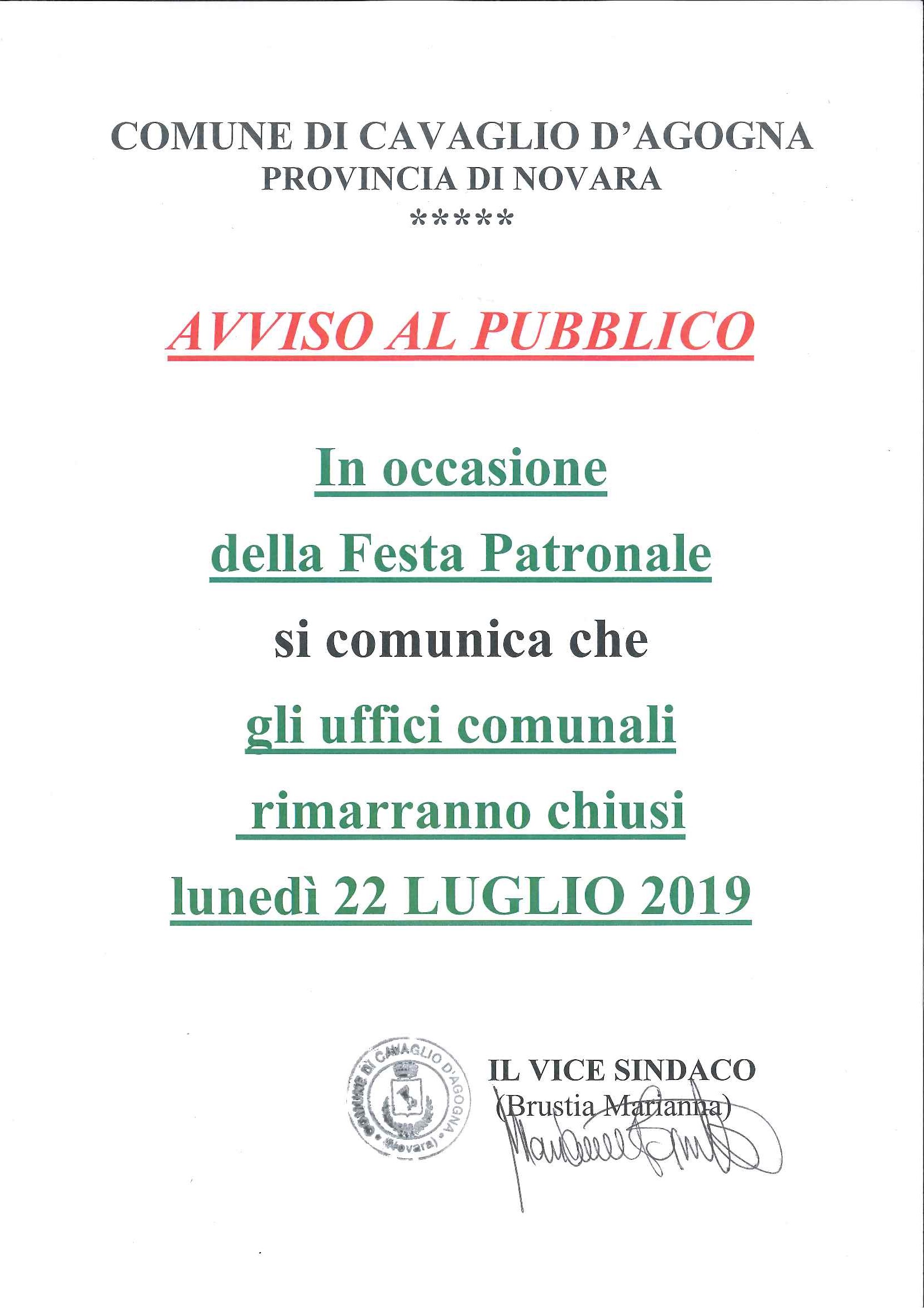 In occasione della Festa Patronale si comunica che gli uffici comunali rimarranno chiusi