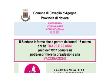 Il Sindaco informa che a partire da Lunedì 15 Marzo chi ha TRA 70 E 79 ANNI (nati nel 1951 compresi) potrà esprimere la preadesione alla VACCINAZIONE
