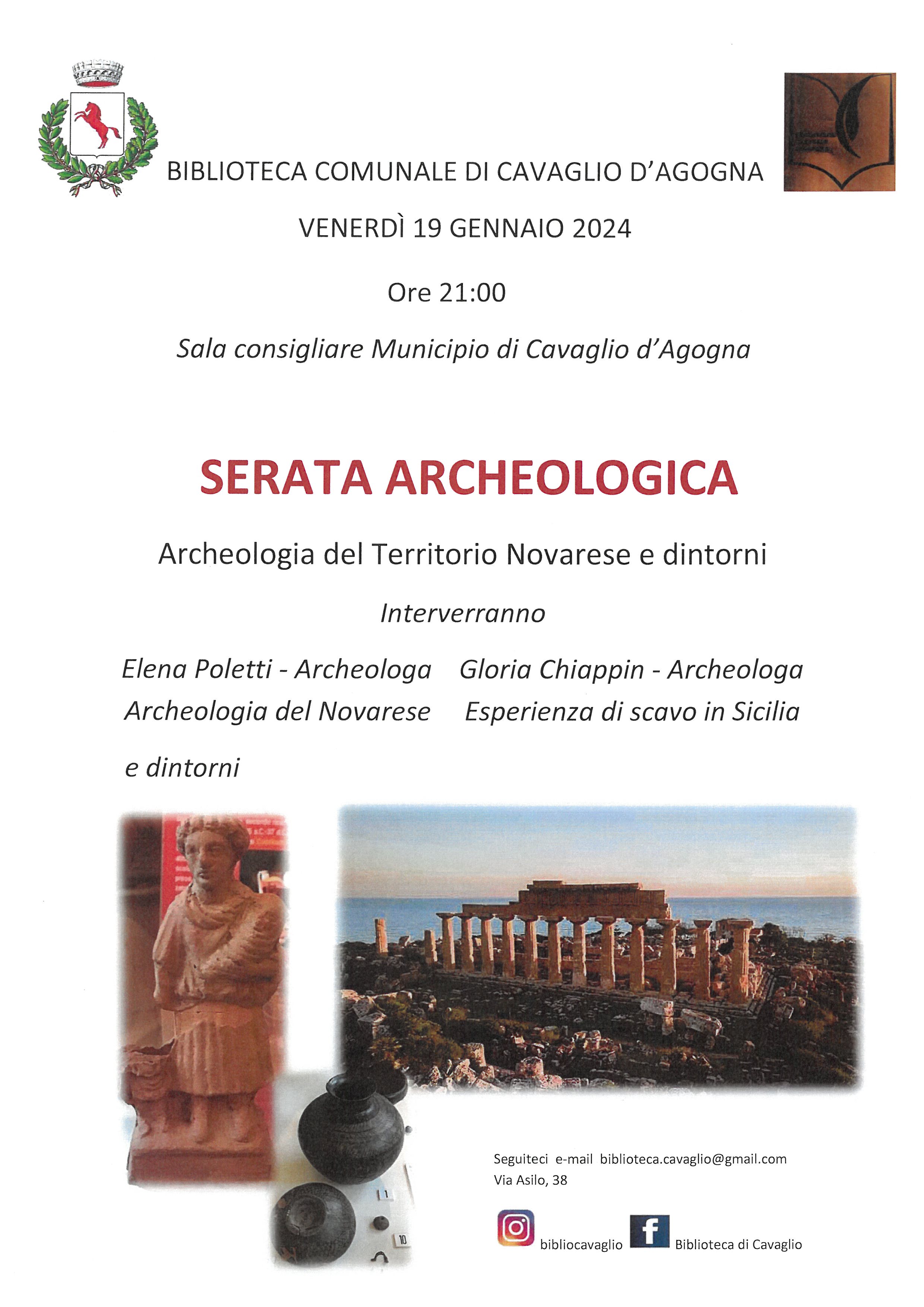 Venerdì 19 gennaio 2024 nella Sala consigliare del Municipio di Cavaglio d'Agogna si terrà una serata archeologica "Archeologia del Territorio Novarese e dintorni" organizzata dalla Biblioteca Comunale.