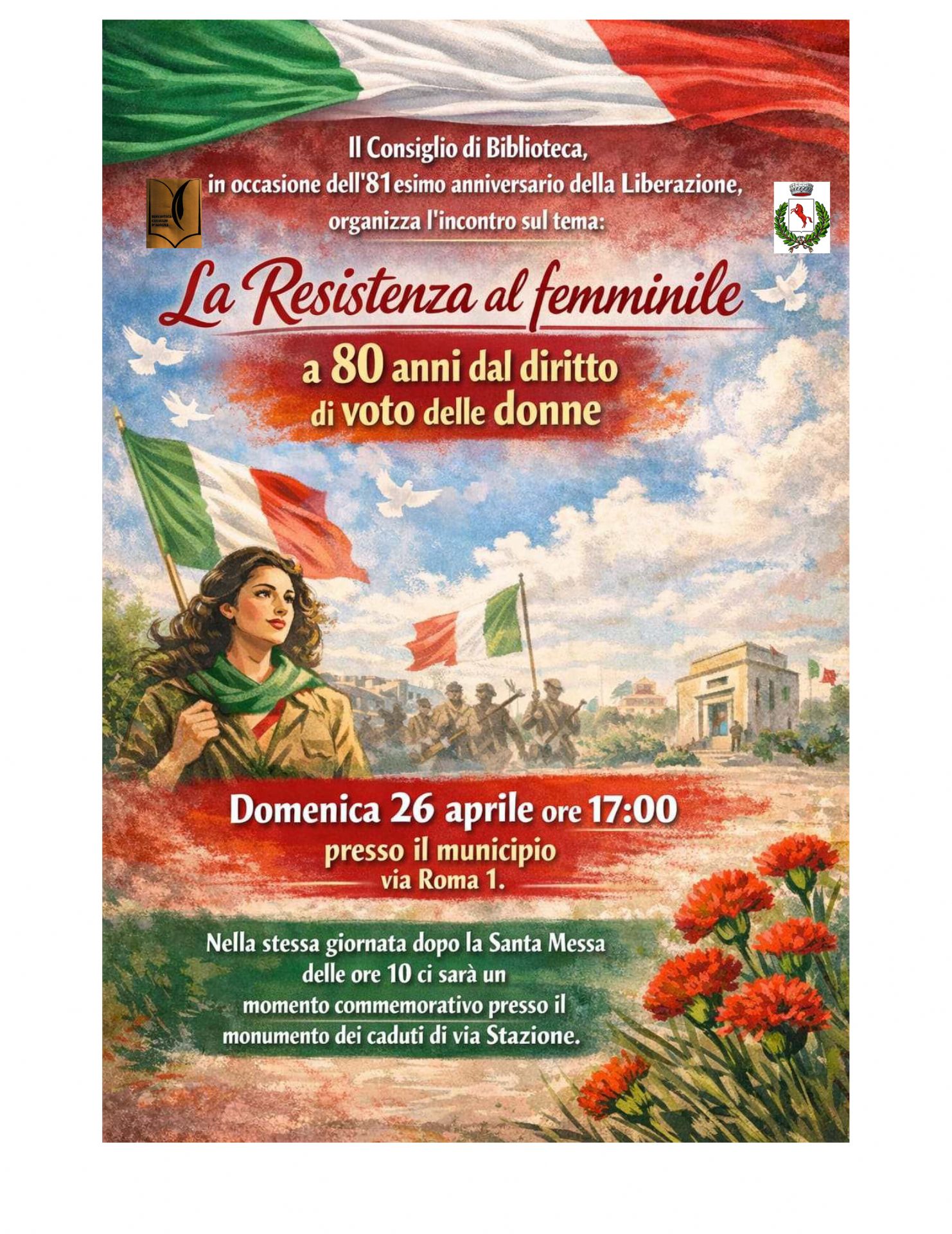 - domenica 26 aprile alle 17.00 presso la sede municipale di via Roma 1 si terrà l'incontro organizzato dalla Biblioteca sul tema "La Resistenza al femminile - a 80 anni dal diritto di voto alle donne"