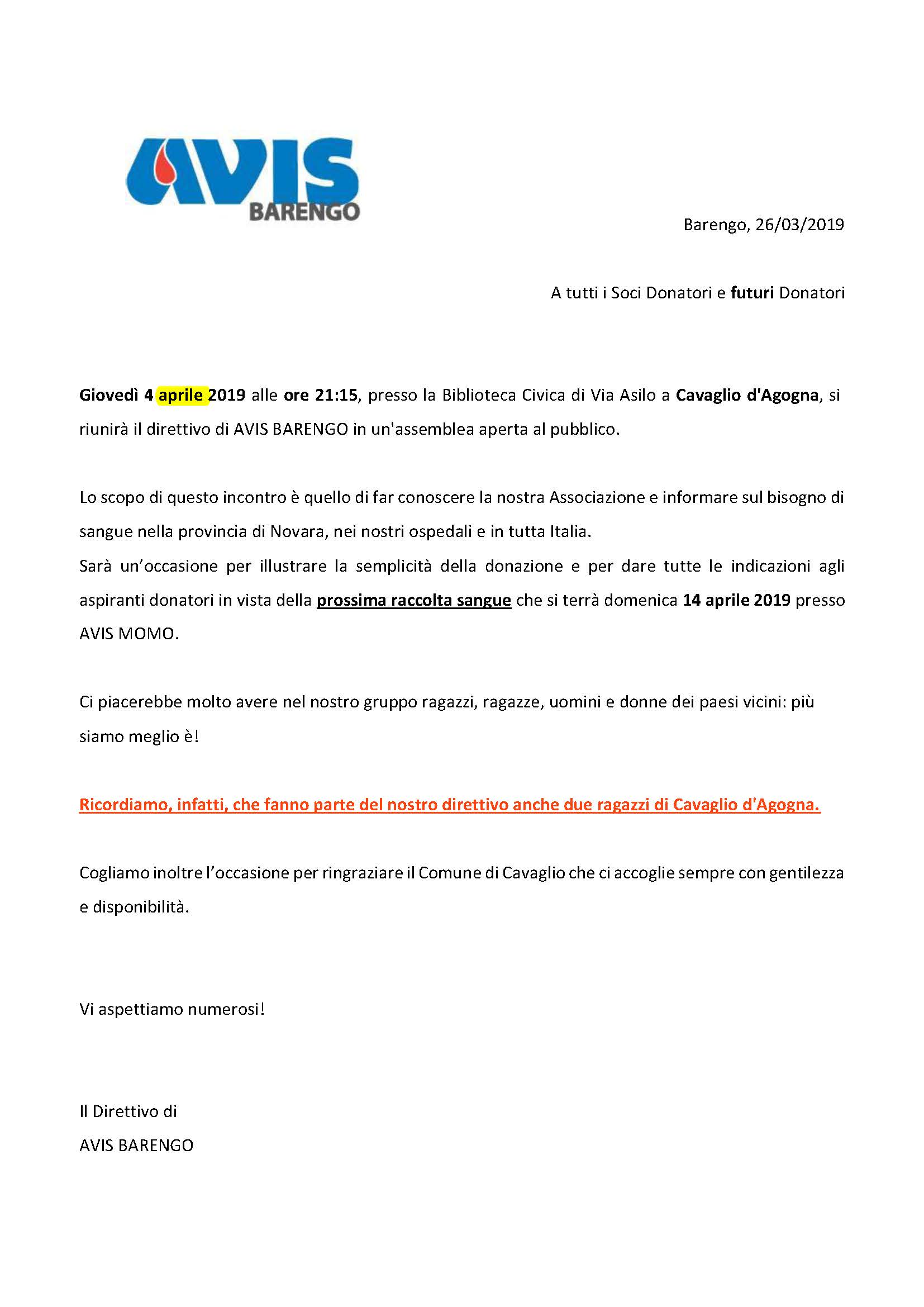 Giovedì 4 aprile 2019 alle ore 21:15, presso la Biblioteca Civica di Via Asilo a Cavaglio d'Agogna, si riunirà il direttivo di AVIS BARENGO in un'assemblea aperta al pubblico